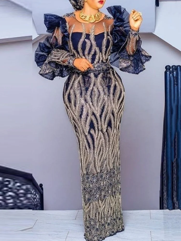 Retro Gold Printing Sequined See-Through Falbala Evening Maxi Dress